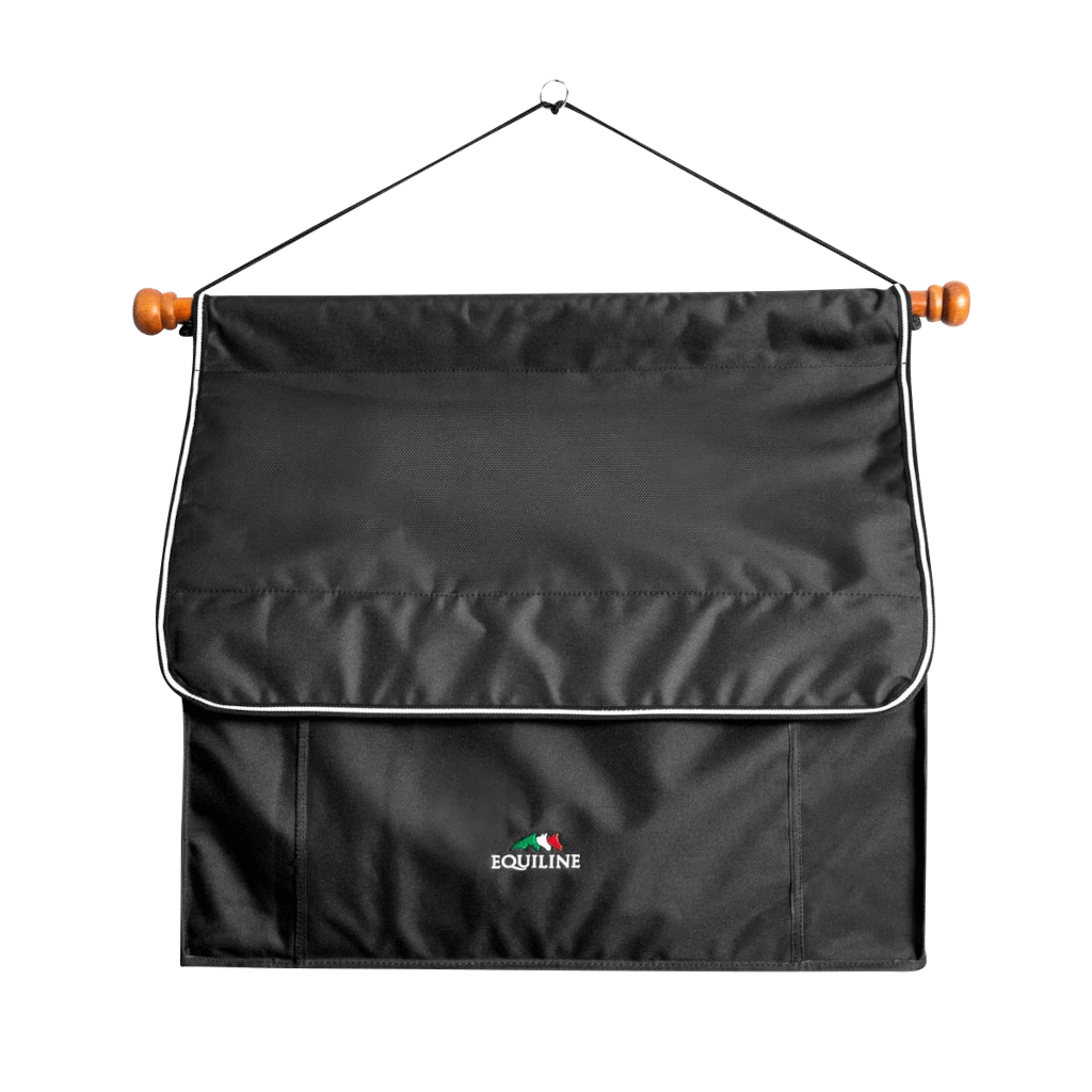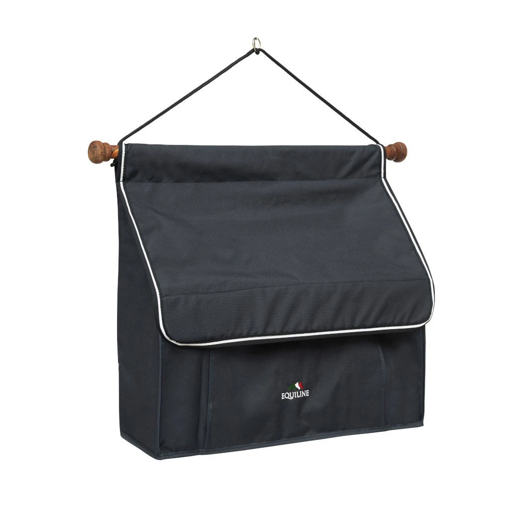 The Equiline Holder accessory bag keeps things tidy in the stable or at the show. It is made of water-repellent, synthetic material and is particularly durable and robust. Thanks to the many subdivisions, the accessories can be neatly stowed away. The bag can be opened and closed quickly and easily with a Velcro fastener. The coloured edging on the hem, the wooden stick and the logo in the middle on the front have a particularly elegant effect. This accessory bag is easily hung on a cord.