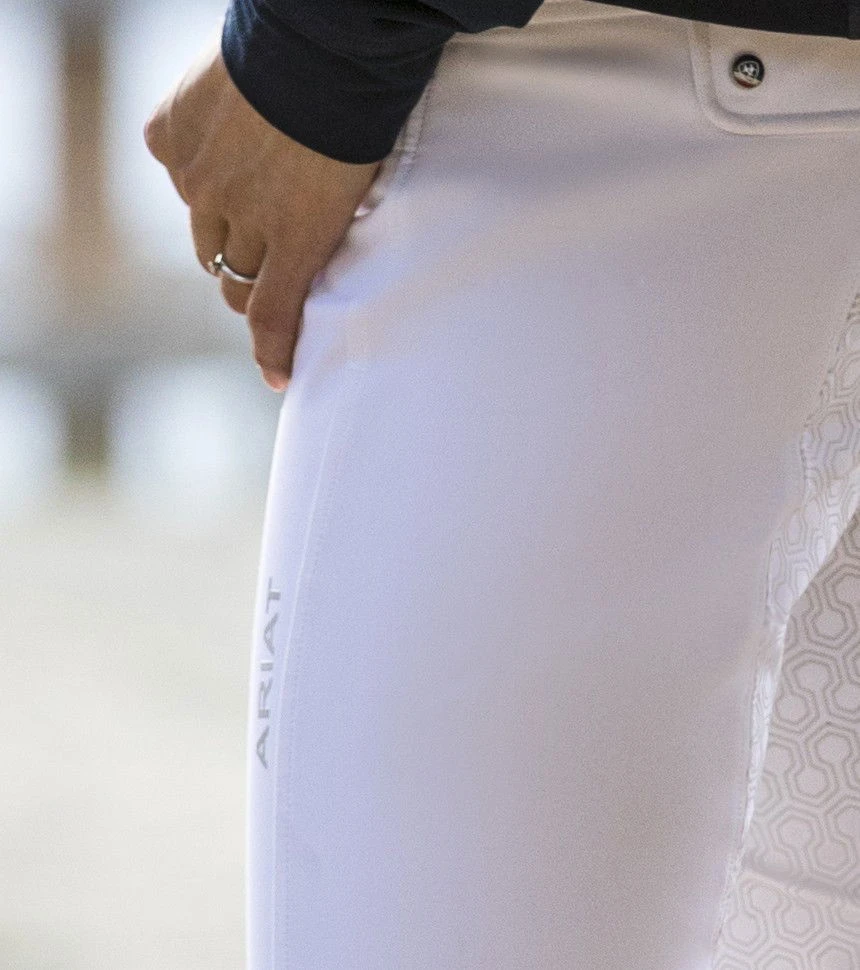 The Tri Factor Grip breeches have a compression material that is equipped with a cooling technology. The Xylitol-based Icefil® cooling system lowers skin temperature and the Moisture Movement Technology ™ wicks moisture away from the body. This high-performance compression material enables the rider to feel comfortable and stable on the horse. The Ariat Hex silicone grip full seat also offers a secure grip and liability in the saddle. The Core Control Technology® provides targeted support for the core muscles and ensures a slim profile. The medium-weight stretch embroidery and the V-shaped Ariat® V3® stretch insert on the back waistband ensure exceptional stretch and shape stability. The CFS ™ Calf Fit System provides individually adjusted support in the calf and ankle area and thus effectively prevents pressure points or chafing in the boots. The patch back pockets and a distinctive logo decoration give the ladies breeches an elegant overall look.