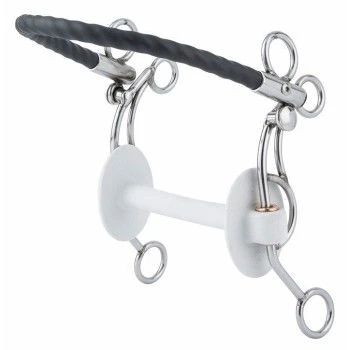 This denture consists of a hard steel inlay embedded in extra soft plastic, which stimulates chewing activity and the associated salivation. The anatomically correctly shaped mouthpiece distributes the pressure evenly over the trays as well as the tongue. The additionally attached bit discs not only prevent the lips from getting caught, but also avoid contact between the horse’s mouth and the stainless steel rings on the sides. This is not only ideal for horses that are allergic to metal, but also provides additional support, which makes the bit lie very still. The Tandem US is similar to the normal tandem in all points, but is characterised by its simpler, black strap, which rests on the most sensitive nasal bone. By accepting the rein, pressure is exerted on the nasal bone, the lower jaw and the neck. A slight pulling effect, i.e. the tilting and lifting of the bit, results when the rein pressure is increased, which is why this bit only belongs in an experienced and sensitive rider’s hand. The “Tandem” is suitable for horses which are too sensitive for a pure bit effect, but which cannot be ridden with a Hackamore only.