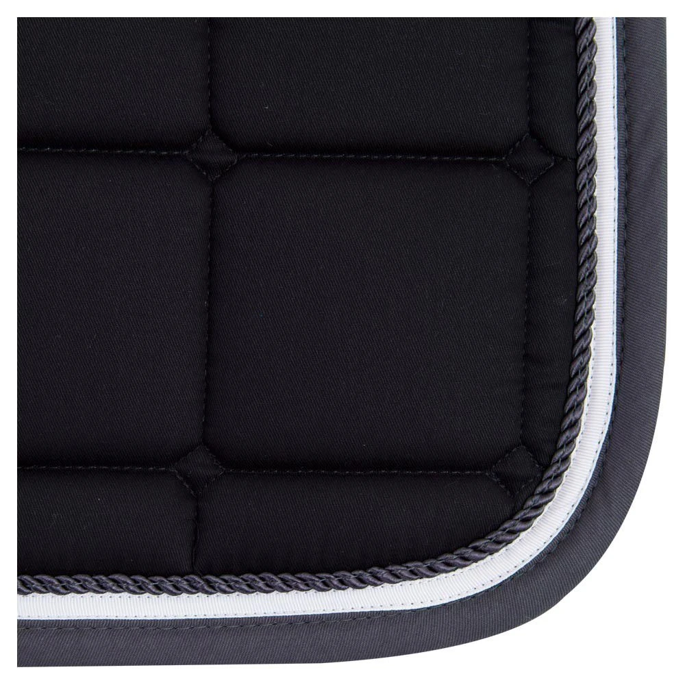 This jumping saddle pad is a fashionable and at the same time functionally excellent saddle pad. An anatomically shaped back seam ensures that pressure on the spine and withers is reduced. The Cool Plus inner lining has moisture-regulating and breathable properties. Shock absorption is provided by the filling of 700g felt and 100mm foam. Another advantage of the saddle pad are the belt loops, which are equipped with Velcro fasteners. Visually convincing is the check stitching of the saddle pad, the piping cord and the decorative tape with which the saddle pad is decorated. The saddle cloth not only makes you and your horse a star at every show or in the stable, but also protects the saddle magnificently from sweat and dirt, thus preventing wear and tear.