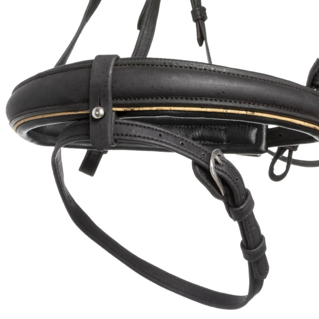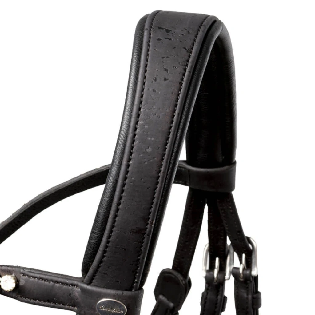 The vegan bridle by Kavalkade is made of a cork / synthetic leather material. The anatomical neck piece distributes the pressure evenly and ensures an ideal fit and a high wearing comfort. The noseband as well as the headpiece are padded with a soft synthetic leather. The noseband is adjustable on both sides and the locking strap is removable. The highlight of this bridle is the sparkling browband and the narrow beige stripe along the noseband.