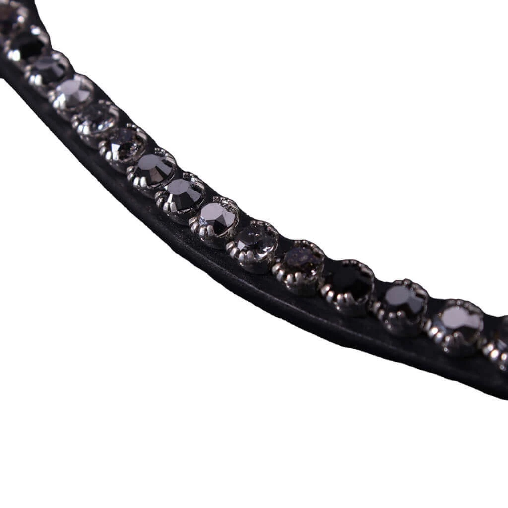 The browband by PresTeq impresses with its elegant design. Equipped with a PressTeq fastening system, an easy change is guaranteed. It is not necessary to dismantle the bridle. The browband can easily be changed in worn condition. It is provided with genuine Swarovski crystals. These shine brightly under any light and make for a special appearance. In a curved shape, the browband is the ideal complement to any outfit.