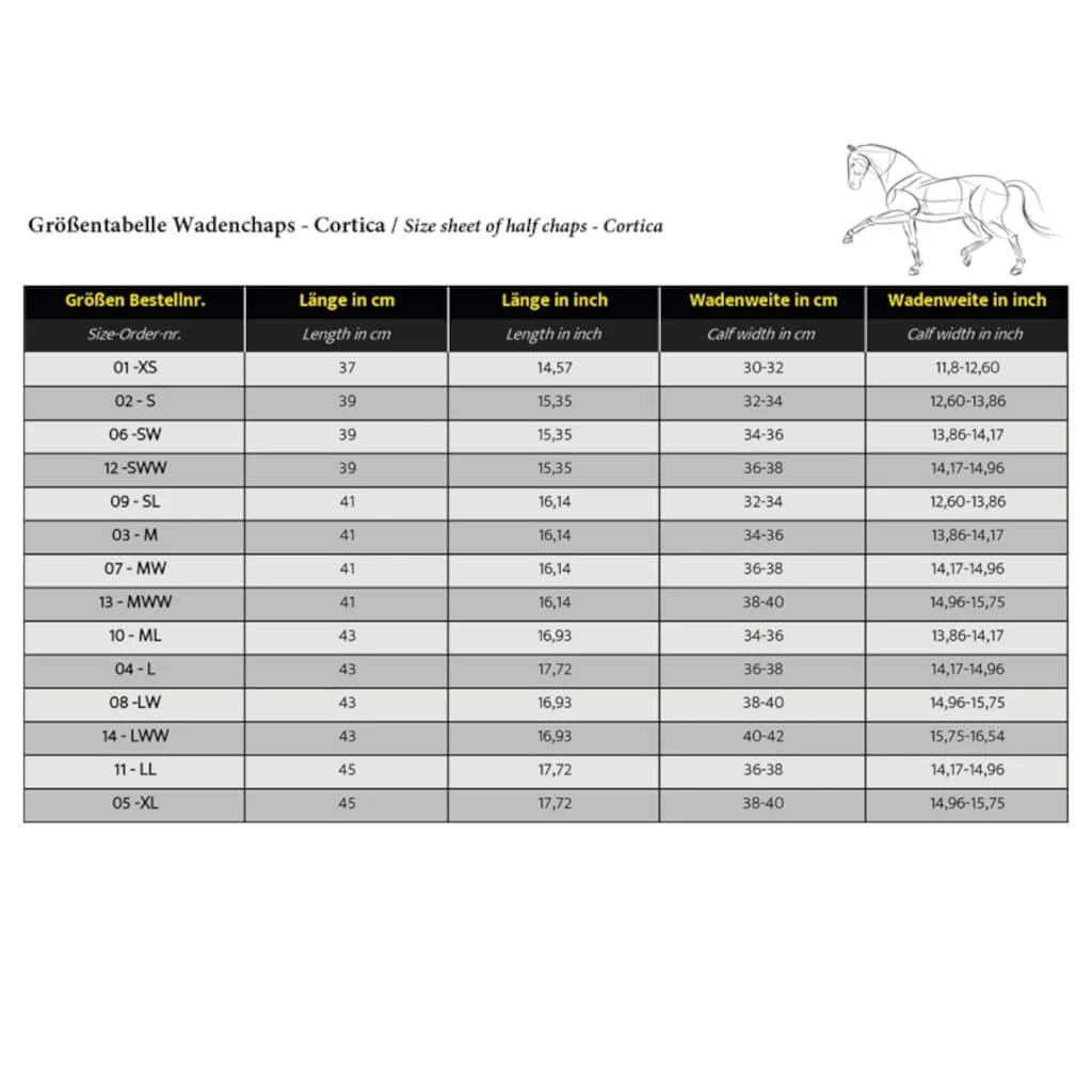 The vegan chaps Cortica by Kavalkade are made of cork on the outside and synthetic nubuck on the inside, which provides a good grip on the saddle. The textile lining provides a pleasant wearing comfort. The elastic inserts allow the chaps to ideally fit the calves without cutting into the leg or restricting the rider’s freedom of movement. The chaps have a smooth zipper and various push buttons to open and close them easily and quickly. In addition, the chaps have a beige contrast stripe on the outside, this makes them a real eye-catcher.