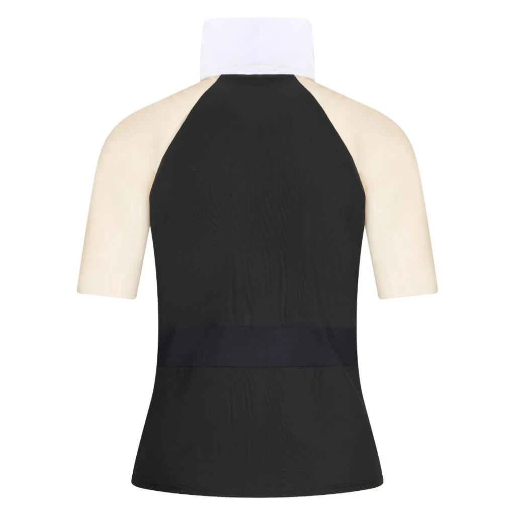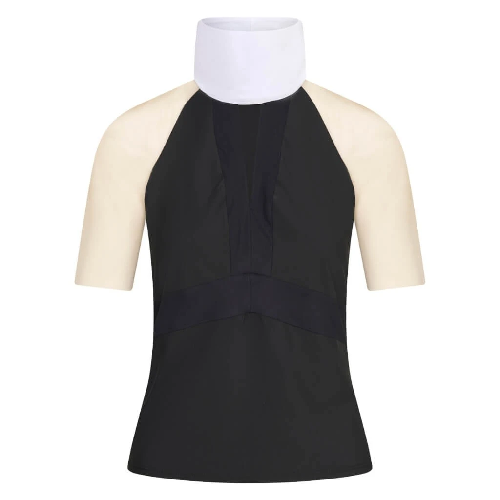 The competition shirt ESFlying Flirty for women out of the Dani G collection by Euro Star is a shirt, which is made of breathable materials. The form-fitting cut of the show shirt makes it perfect for brave and self-confident female athletes. Thanks to the flexible materials of the shirt, it is close-fitting and emphasizes the shape of the rider’s body, but does not restrict her movement. To avoid excessive sweating on hot summer days, the shirt is made of a light, breathable fabric in the areas prone to it. The 3/4 sleeve length was chosen to hug the upper arms without being bulky under a jacket. Especially the sporty and self-confident look as well as the composition make the shirt a real must-have for warm stable and show days.
