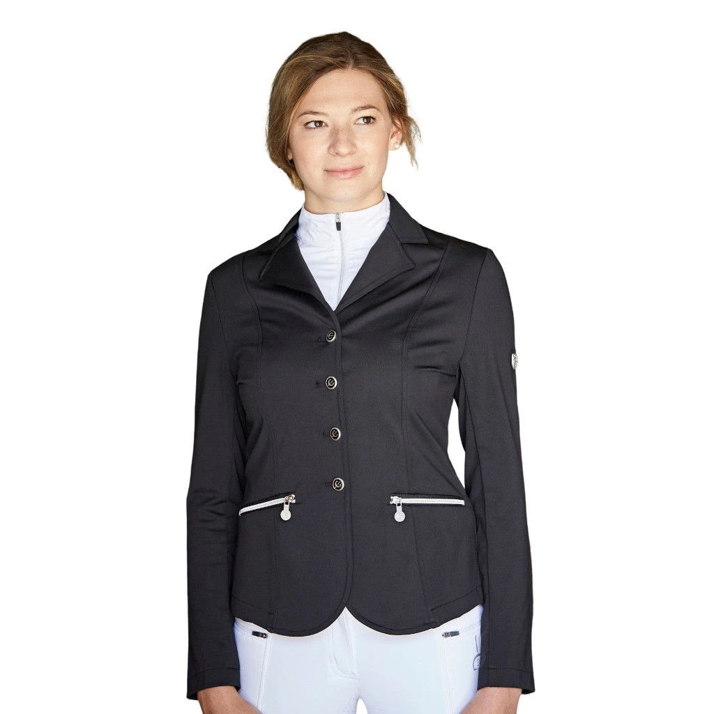 The jacket Samantha by Covalliero has a water-repellent outer material. Due to its elastic material, it offers the rider a high degree of freedom of movement, which makes it particularly comfortable to wear. Samantha has a waisted cut so it nestles particularly to the female body shape. Due to the air permeability the jacket offers additional comfort. On the front there are two outer pockets that can be closed with a zipper. On the left arm there is an elegant crest. In addition, the Covalliero logo can be found on the noble buttons. Two riding slits at the back offer the rider additional freedom of movement. The simple but elegant design makes the Samantha jacket a great companion for the perfect competition appearance.
