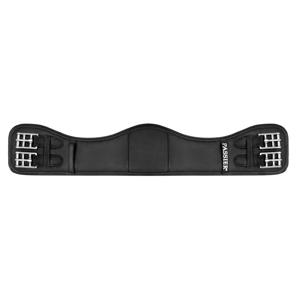 The curved leather saddle girth by Passier has a short shape and is very suitable for dressage riding. Thanks to the supple leather and the additional padding, the horse has a pleasant wearing comfort and can easily wear the girth for a longer period of time. In the middle of the girth is a D-ring, so you can attach auxiliary reins, martingale or breastplate quickly and easily. The D-ring has a Velcro tab, which allows it to be covered when not in use. The elbow cutouts prevent chafing and thus unnecessary injuries. On one side there is a Passier lettering, which underlines the noble appearance of the girth. Due to the high-quality material and the special shape, the horse has a high freedom of movement, making the girth suitable for daily training.