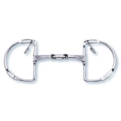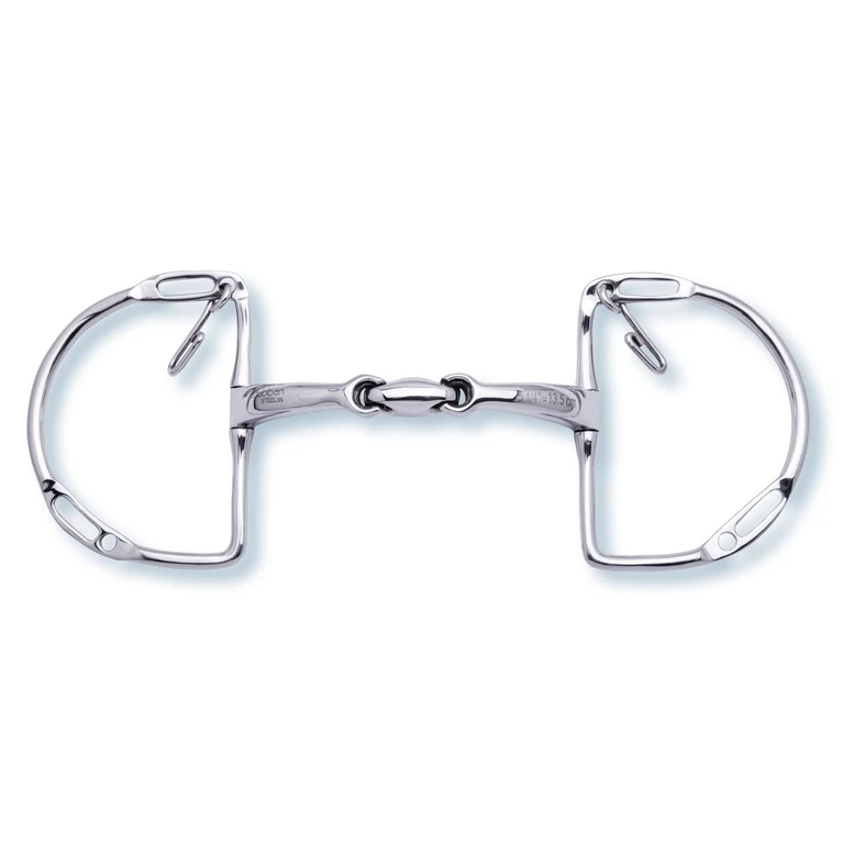 Stübben’s “Easy Control” jumping curbs are optically hardly different from other jumping curbs, but there is a small but decisive difference. If the bit lies still in the mouth without pulling, it adapts optimally to the contours and anatomy of the horse’s mouth. However, if the horse presses against the bit and a certain angle is reached in the bit joint, the “Easy Control” blocks and has a bar-like effect. If the horse releases the pressure, the bit also comes to rest comfortably in the mouth. So if you have a horse that is going against the reins, it will be corrected by the bar effect and will be strengthened by the comfortable position in a calm state. For this reason this bit serves as a correction or training bit, because it has a self-learning effect. The large D-rings at the sides of the bit also provide it with a very calm and stable position in the mouth and offer lateral support and stability, especially for horses that have not yet fully accepted the laterally limiting aids. The special feature here is the versatile use of reins and chin chain, which can be attached in different ways with this multi-functional bit.