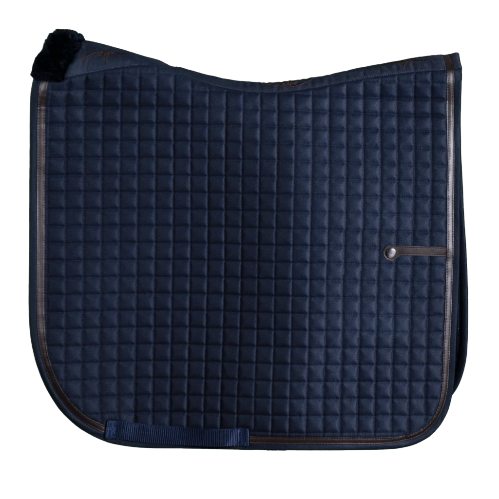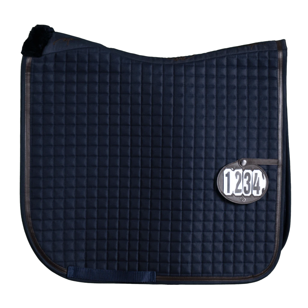 The dressage saddle pad HLA Classic by Dyon convinces by its simple design as well as the patented fastening system for starters’ numbers. The system consists of a narrow leather strap, which is equipped with a push button to attach the starternumber directly to the saddle pad. In this way, the number remains in its intended place and cannot fall off. The saddle pad is also functionally convincing. Its square quilting absorbs shocks and vibrations and thus relieves the sensitive horse’s back. For additional comfort, a fur patch is attached to the withers to prevent friction and pressure points. To keep the saddle securely in place and prevent it from slipping, the saddle pad features a convenient girth loop. The classic design of the saddle pad is emphasized by a border made of a narrow leather strap.