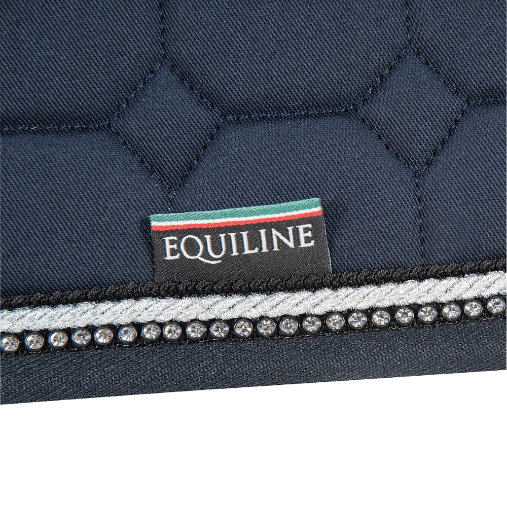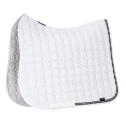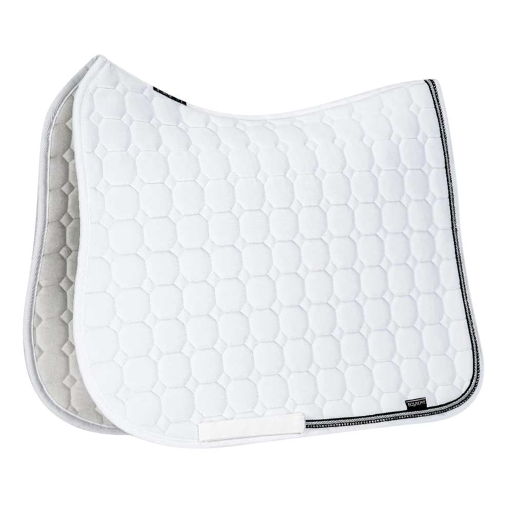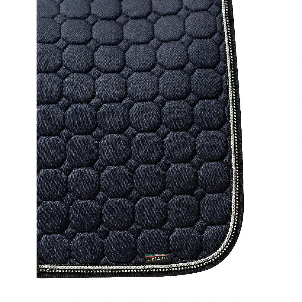 The high-quality Equiline dressage saddle pad Rio with large diamond pattern is made of a durable cotton blend fabric, while the honeycomb inside was left natural colored, so that the horse’s back does not come into contact with dyes. The inner lining is made of 100 percent hypoallergenic and soft cotton. The filling of the saddle pad with 900 g of cotton has shock-absorbing properties and is thus gentle on the horse’s sensitive back. Due to a unique Air Control System, optimal air and moisture circulation is ensured and assures maximum breathability. This system also reliably absorbs any impact energy and distributes the pressure evenly over a large area of the horse’s back. The manufacturing combines highest functionality with an elegant, classic design.