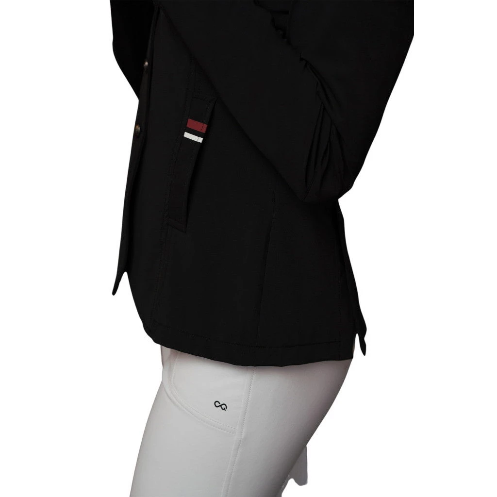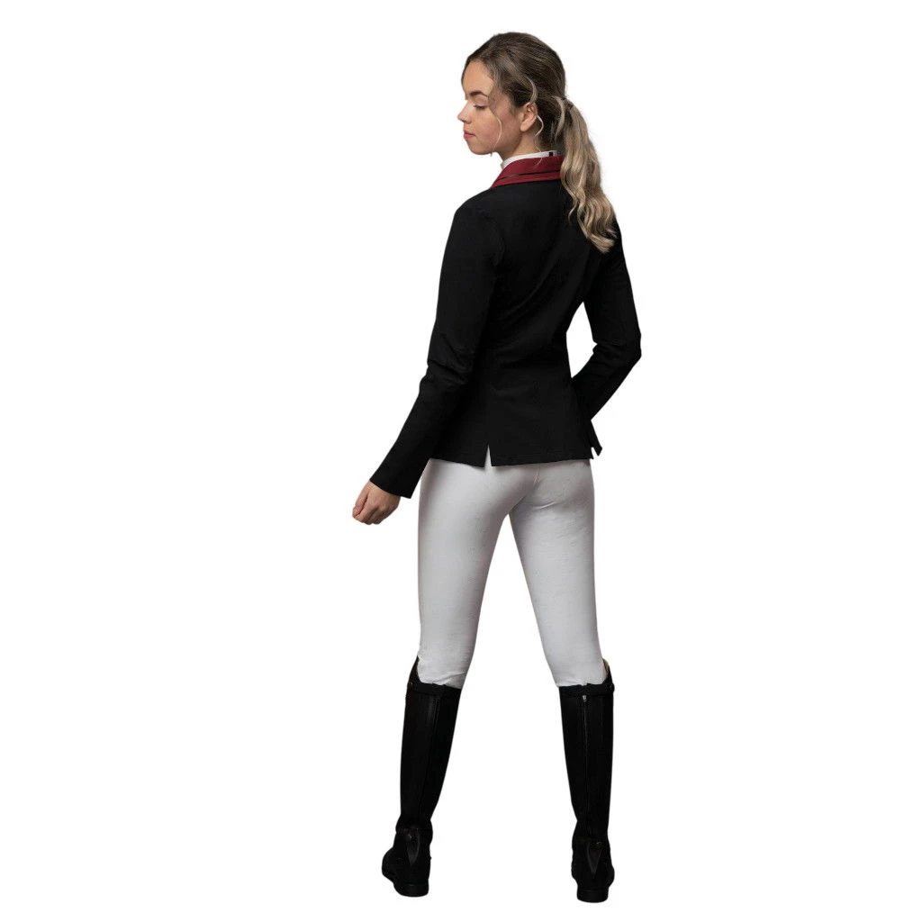 The competition jacket AmbitionFirst is made by PresTeq. The 4-way stretch material guarantees a high wearing comfort. It is also water repellent and breathable. Behind the buttons on the front there is a zipper to close the jacket. The 2nd Skin TEQ fabric and a tailored fit provide the feeling of a second skin. Special details on the collar guarantee a stylish appearance. There are 2 slits on the back for the perfect fit on the horse.
