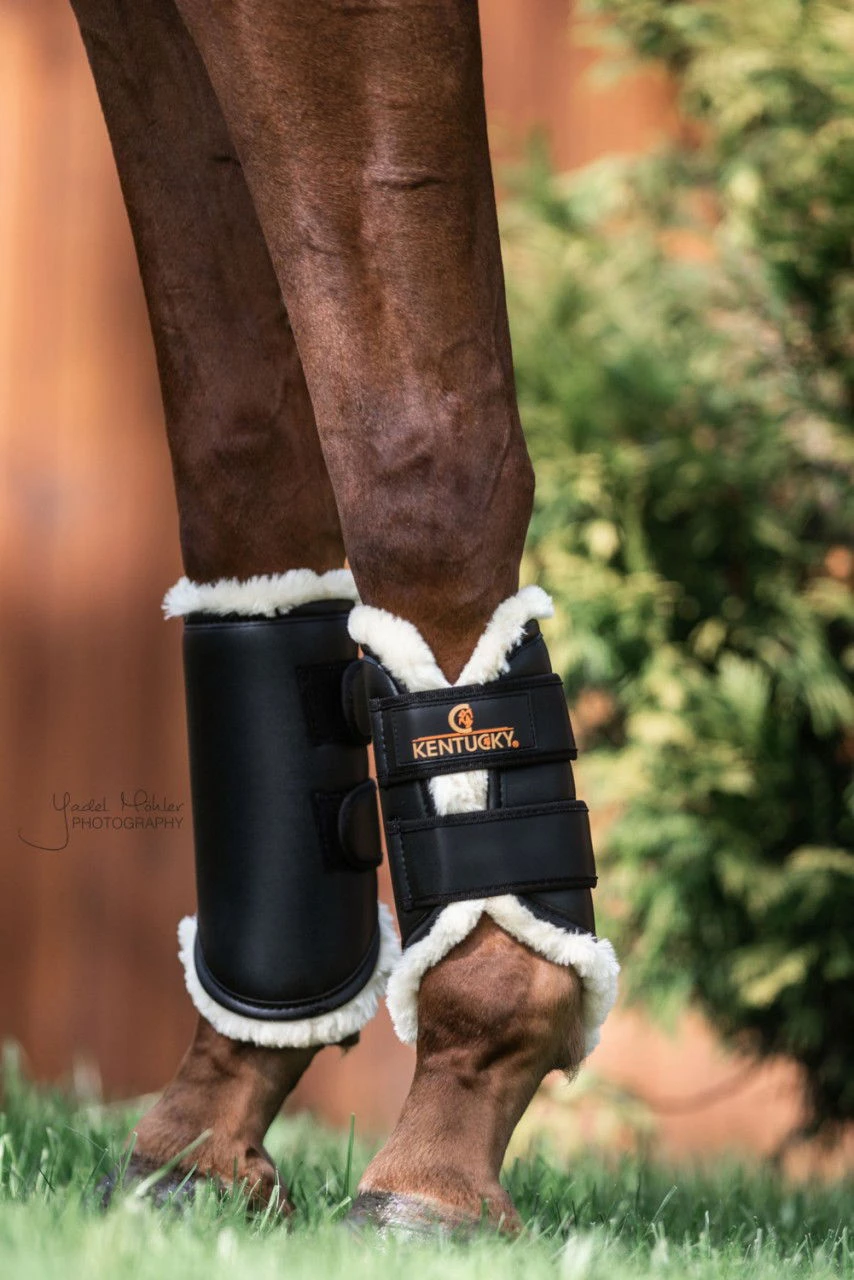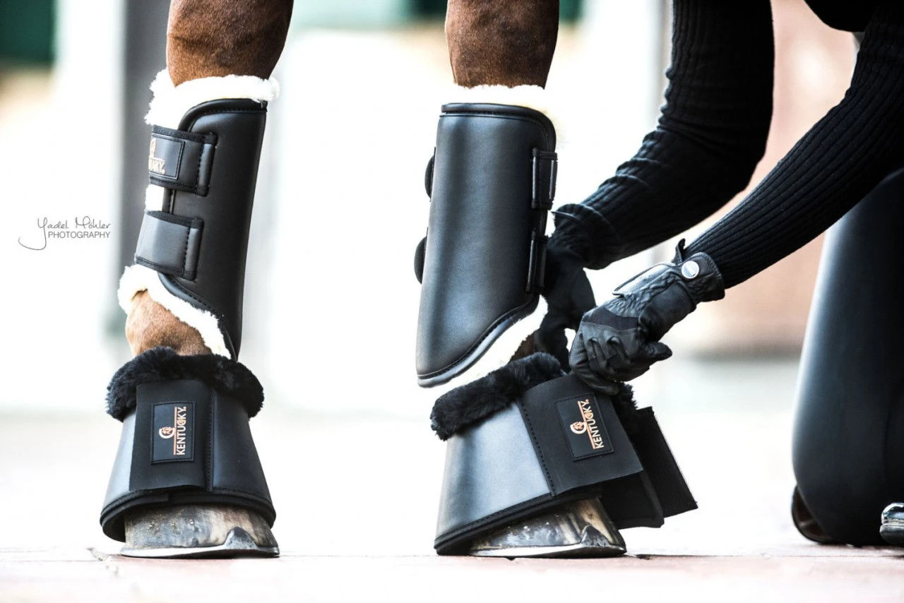 The Kentucky brand leather work boots have a classic look and are made with the most modern materials. On the outside the boots are equipped with a durable and completely waterproof PVC leather. Inside they are equipped with a comfortable sheepskin and EVA-plastic. This combination of materials results in a cost-effective and everyday usable working boot for your horse, which protects the horse’s legs optimally. Due to the anatomical fit and two strong and secure Velcro fasteners, these gaiters offer 100% comfort, even for horses with sensitive skin. These gaiters are ideal for working in your own stable, leading by hand, moving in the horse walker, lunging and more.