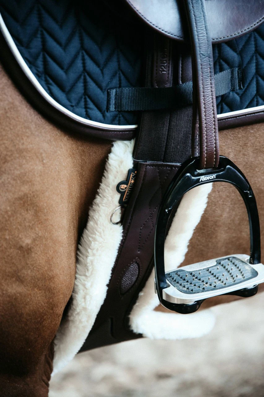 The “Special” studded belt with lambskin from Kentucky Horsewear not only protects your horse from studded belly hits, but also from pressure and chafing and looks beautiful by the way! Thanks to its special shape, the girth follows the horse’s natural movements and also relieves the shoulder and forefoot joints. The girth becomes a real eye-catcher thanks to the “basketball design”, which also makes the girth look very classy. Thanks to the buckles at the ends of the girth, you can connect it to the saddle so that it doesn’t slip and always sits securely, even during a fast ride. The material is protective EVA on the inside and artificial sheepskin and leatherette on the outside. The imitation leather does not absorb water, sweat or dirt and therefore has a long lifetime. Thanks to the artificial fur, the horse is comfortable to wear and you can wear the girth both in summer and in winter because it is breathable and does not store moisture or heat. The sheepskin is attached by a strong velcro fastener, so that you can remove it and wash it if necessary! On the front side there is a D-ring in the middle, which is very practical for attaching martingales or auxiliary reins. At the ends there are also elastics, which distribute the pressure, so that the pleasant wearing comfort is supported. A beautiful strap with many practical features that you should not miss!