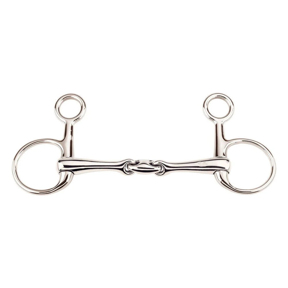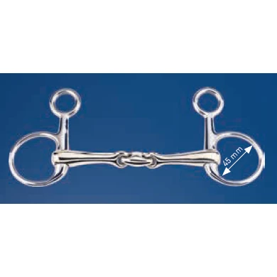 The KK Ultra baucher comes with an anatomically shaped mouthpiece, the centrepiece of which is inclined forwards by 45°. This inclination allows a precise and at the same time gentle action, which is not only gentle on the horse’s tongue but on the whole mouth. The special feature of this bit is its buckling, as the rein is buckled into the lower large ring and the cheek piece into the smaller upper ring. This increases the pressure on the neck – with simultaneous effect on the lower jaw. As the mouthpiece is firmly anchored in the lower ring, it also protects the lips and lies close to the tongue. Please fasten all dentures marked with an arrow so that the arrow on the left hand points forward.