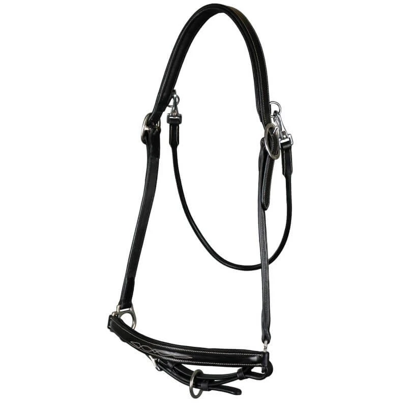 The halter WC by Dyon is a grooming headcollar made of buffalo leather. The halter is specially designed for head grooming. The halter has a throatlatch that is attached with snap hooks and can be removed if necessary. In addition, the headpiece on both sides and the noseband underneath can be adjusted to fit the halter to the horse’s head and increase comfort. Decorative embroidery on the cheek pieces and noseband and stainless steel fittings perfectly complete the elegant appearance of the halter and make it an eye-catcher.