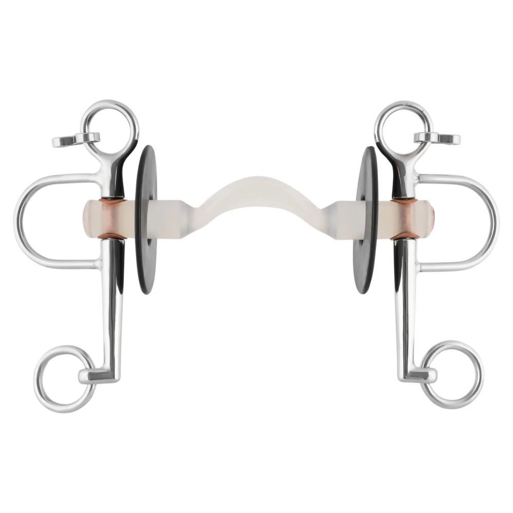 Since January 2020, Sprenger has taken over the worldwide distribution of Nathe dentures and thus combines two quality brands “Made in Germany” under one roof. Both Sprenger and Nathe are interested in constantly improving the quality, functionality and design of their products. Nathe’s plastic dentures complete the Sprenger product range and make it possible to offer dentures for all kinds of demands and wishes. The Pelham comes with a tongue bow bar made of hypoallergenic plastic, stainless steel side parts and a steel core, which makes the bit safer and more durable. The length of the suits can be chosen between 5,5 cm and 7 cm, depending on the length the leverage is bigger or smaller. With a short lever the pressure on the neck is minimized, but the distance is very short so that the aids reach the mouth faster and more directly. The longer suit is a little slower, but due to its great leverage it also has a stronger effect on the neck. In both cases the use of the suit requires a sensitive and experienced rider. The laterally attached bit discs effectively prevent the lips from getting caught and successfully round off the image of this Pelham.