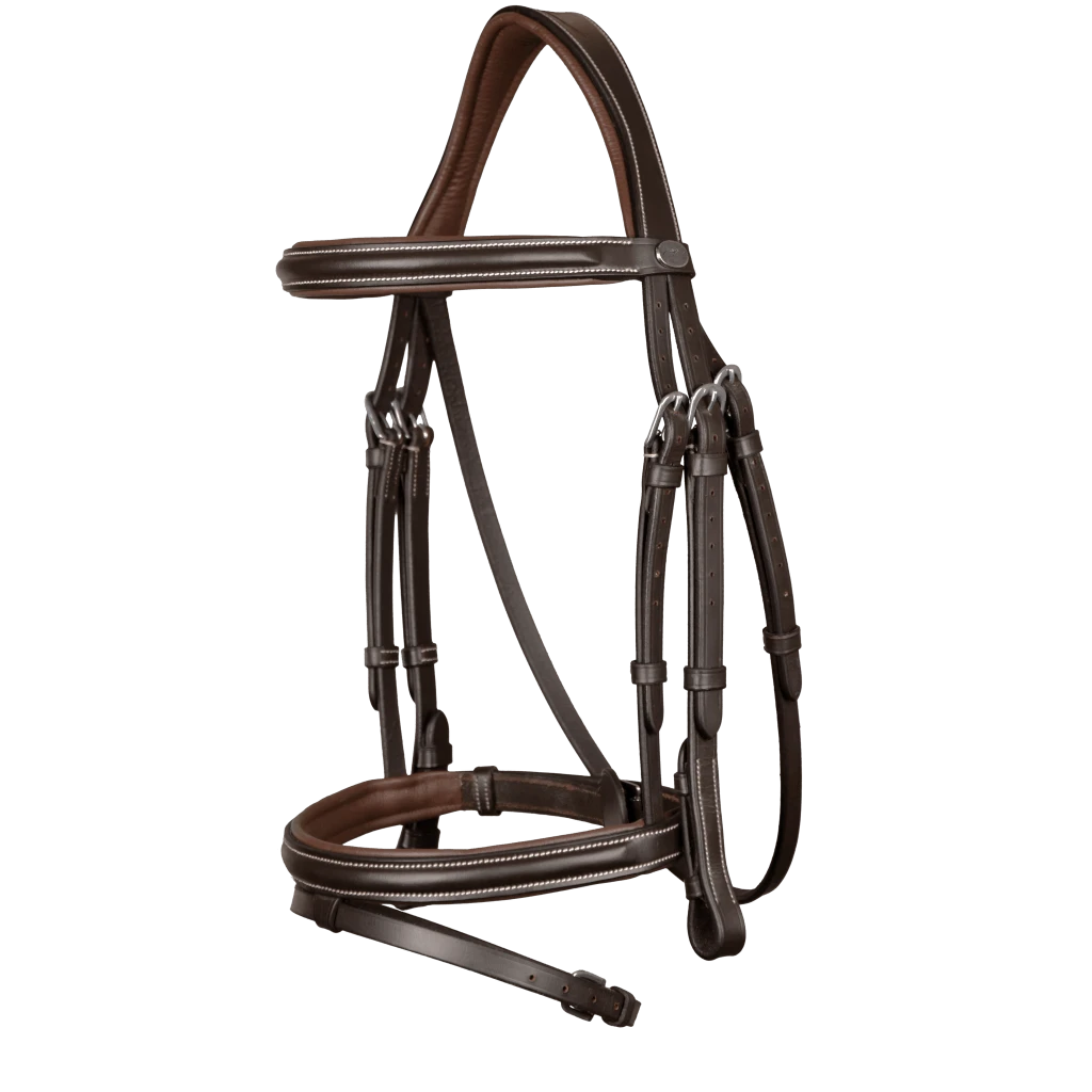 The bridle Classic Flash by Dyon is part of the Working Collection. This was specially developed for daily use and is made of particularly durable materials such as buffalo leather and stainless steel fittings. The headpiece is anatomically shaped to allow sufficient room for the ears and for additional comfort, the bridle is softly padded in the neck, forehead and nose area. In addition, the bridle has a 13 mm wide, removable locking strap. The cream-colored stitching provides a beautiful contrast and makes the bridle look particularly classy in combination with the straight browband.