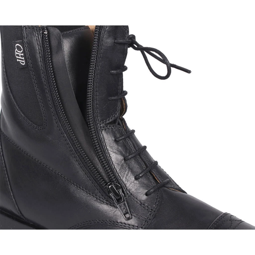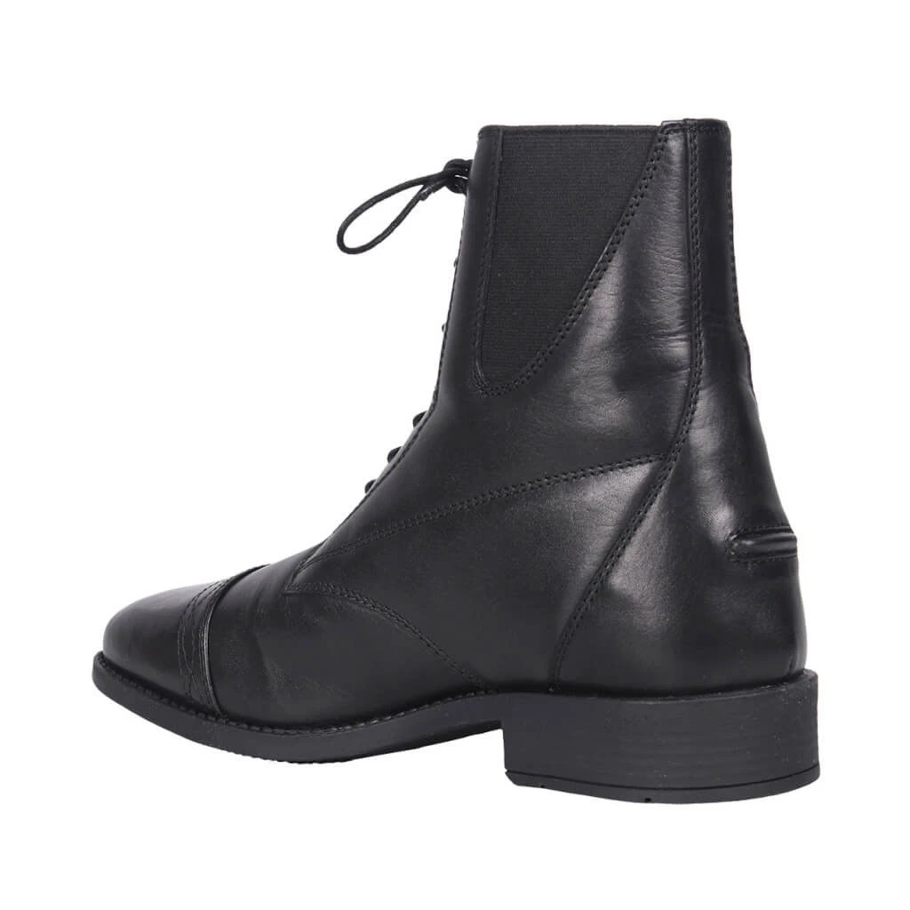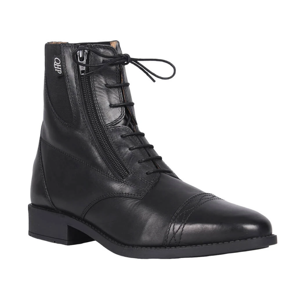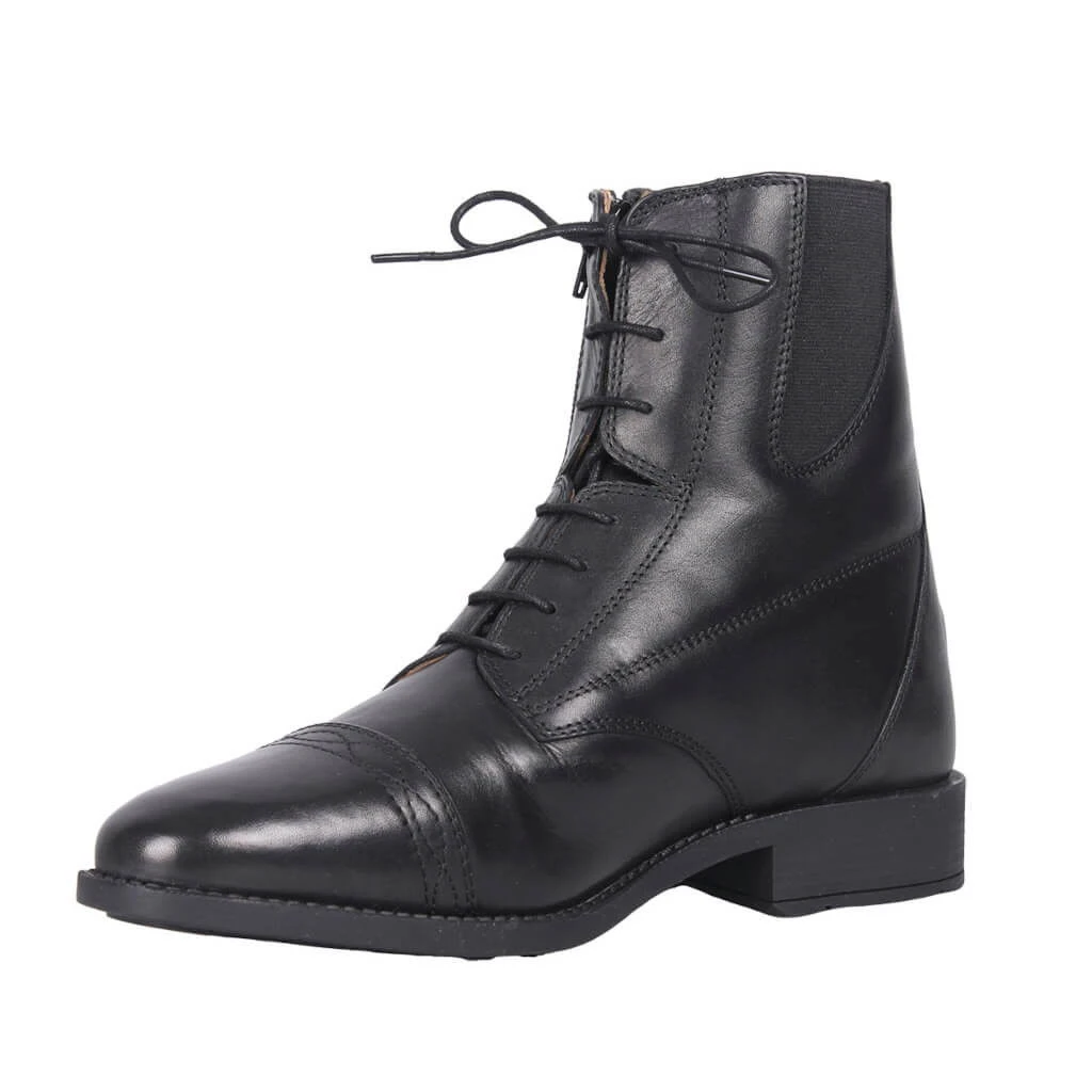 The paddock boot Ezra by QHP is a classic model made of quality cowhide leather and a comfortable footbed. In addition, the paddock boot convinces with some great details. The cap of the paddock boot is decorated with a decent decorative stitching, while the stylish lacing allows for an individual fit. Easy on and off of the Ezra paddock boot is ensured by the angled, exterior zipper. Additional comfort is given by the two rubber inserts on the shaft, which has created increased freedom of movement. The ankle area has also been softly lined. A spur holder has been integrated at the heel, which prevents the spurs from slipping and allows for optimal thigh support.