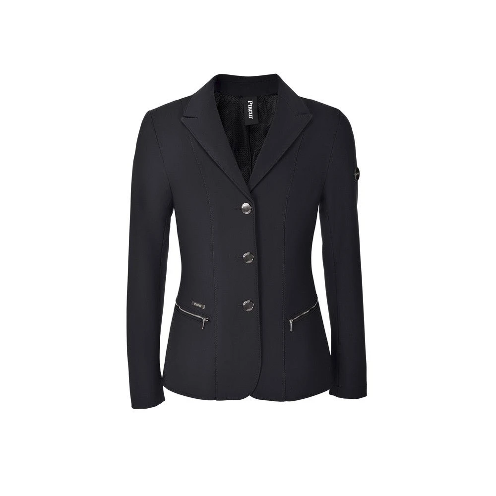 The classy yet very sporty looking Manila jacket by Pikeur is lightweight, very elastic and breathable. A narrow cut, in addition to the sleeves that can be extended up to 5cm and the three eyelet buttons in the front, which are either in the color rosé or gunmetal, ensures optimal wearing comfort and is therefore perfect for kids. An implied waist belt with snaffle bit applications makes the jacket a real eye-catcher. A Pikeur rivet plaque on the sleeve and above the pocket adds variety and makes the jacket an ideal show companion.