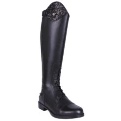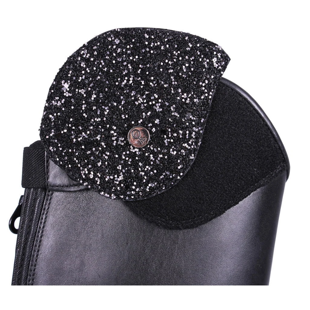 The Romy Junior riding boot by QHP can be easily customized to suit individual style with the interchangeable tops on the boot shaft. The boot is delivered with a black glittery top as standard and can be changed via separately available designs. Via the Velcro closure, the upper part is changed in a few simple steps and the boot shines in a new look. The Romy Junior riding boot has a modern and close-fitting fit and a middle shaft arch, which visually stretches the leg and allows the boot to be worn in all disciplines. The elastic insert next to the zipper at the back allow easy on and off and comfortable wearing. The lacing at the ankle provides sufficient freedom of movement. The foot area is lined with a breathable fabric, so there is no heat buildup in the shoe. The insole is made of synthetic leather. The shoe sole made of rubber provides sufficient grip in the stirrup as well as surefootedness in everyday stable life.