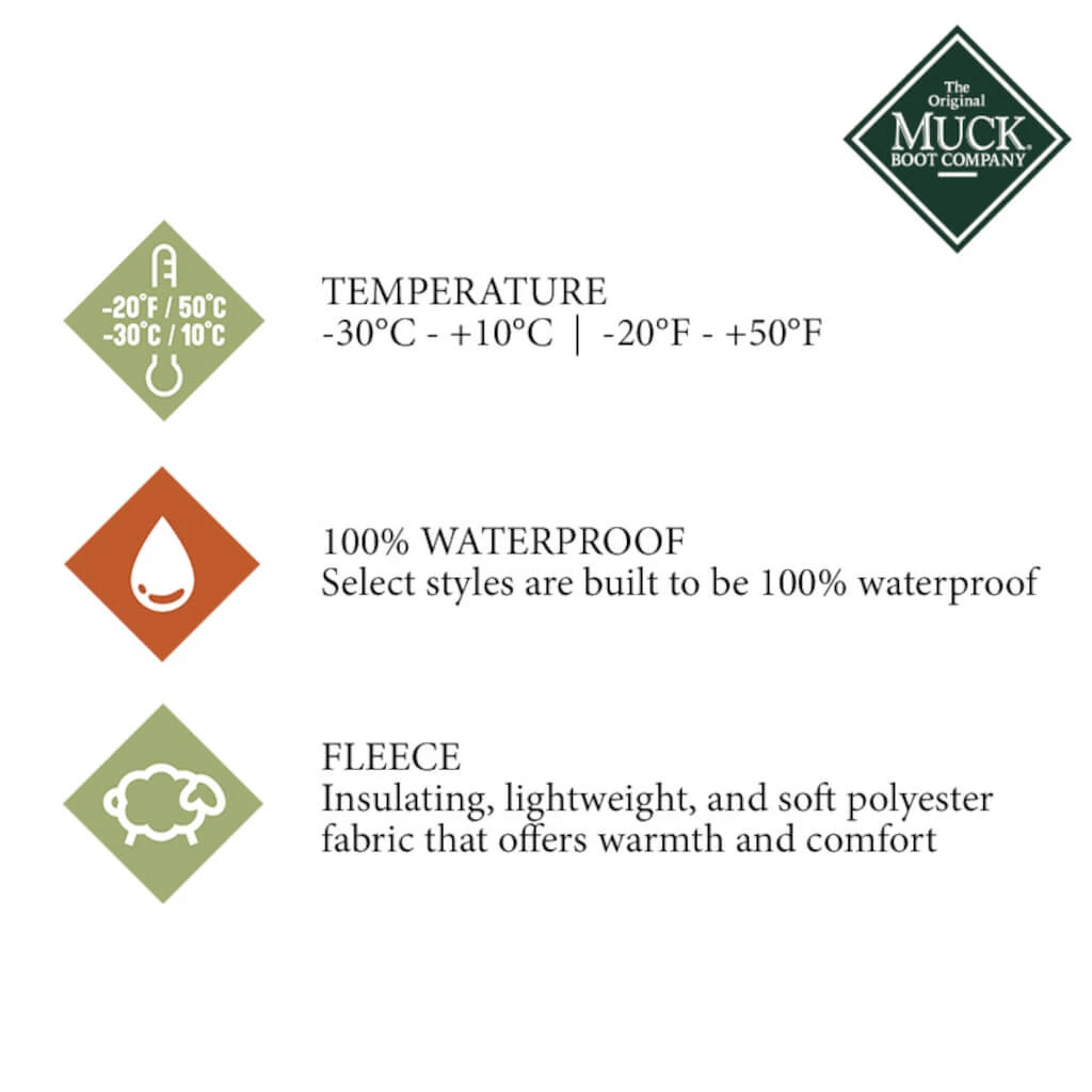 - fleece lined boot has Muck Boot’s signature stretch fit with neoprene that keeps warm air in and cold air out
