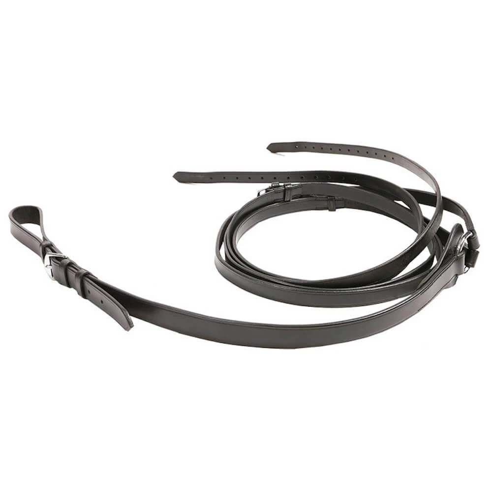 The running reins Kavalkade are practical and adjustable reins made of black leather with silver fittings for riding and lunging. The bridle is attached to the saddle girth, runs divided through the bit rings and goes past the front legs back to the saddle girth, at the level of the saddle flaps. They can be used from pony to warmblood. Manufacturer number: 264 01