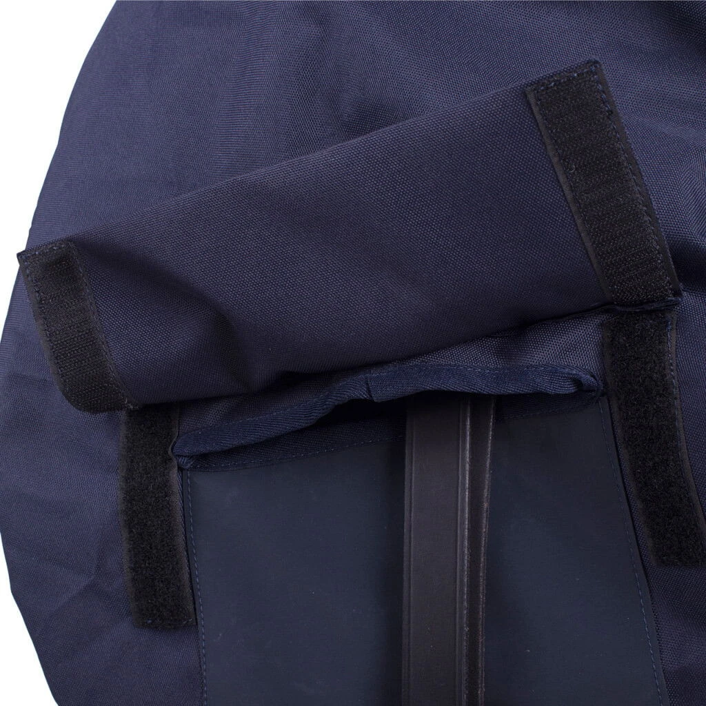 The water-repellent saddle cover Turnout Extra by QHP can be used both for transporting the saddle, as well as when riding to avoid dirt and scratches. The saddle cover is simply pulled over the saddle for use. The elastic on the edge of the cover provides sufficient grip. The carrying strap can be pulled through the loop on the saddle rim for transport and placed once under the saddle. Thus, the saddle can be easily transported and is protected from wind and weather. When the carrying strap is no longer needed, it can simply be stored in the zippered pocket on the saddle rim. To use the saddle cover Turnout Extra also during the ride, the stirrups can be pulled through the slots with velcro. Additional support is provided by the recesses for the girth straps.