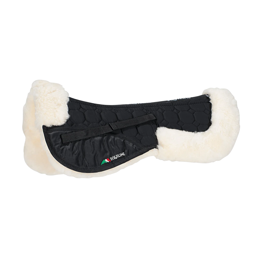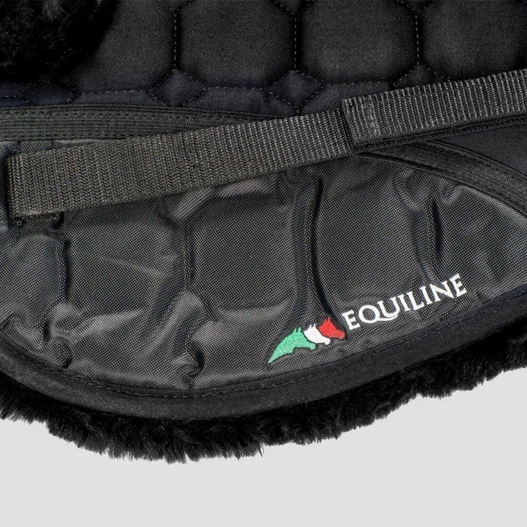 The Argo lambskin pad from Equiline not only looks great, but is also very versatile. The outside is made of cotton with octagonal quilting and the inside is made of genuine lambskin. The pad is ideal for relieving the back, balancing or even preventing back problems. It also has an ergonomic shape and adapts ideally to the horse’s back. The saddle loops are equipped with Velcro fasteners, so the pad can be easily fixed to the saddle. Additional lambskin pads are attached at the withers and at the end of the saddle pad. The chic Equiline logo can be seen on the side. The pad can also be worn on warm days without any problems, as it is breathable and thus prevents heat build-up.