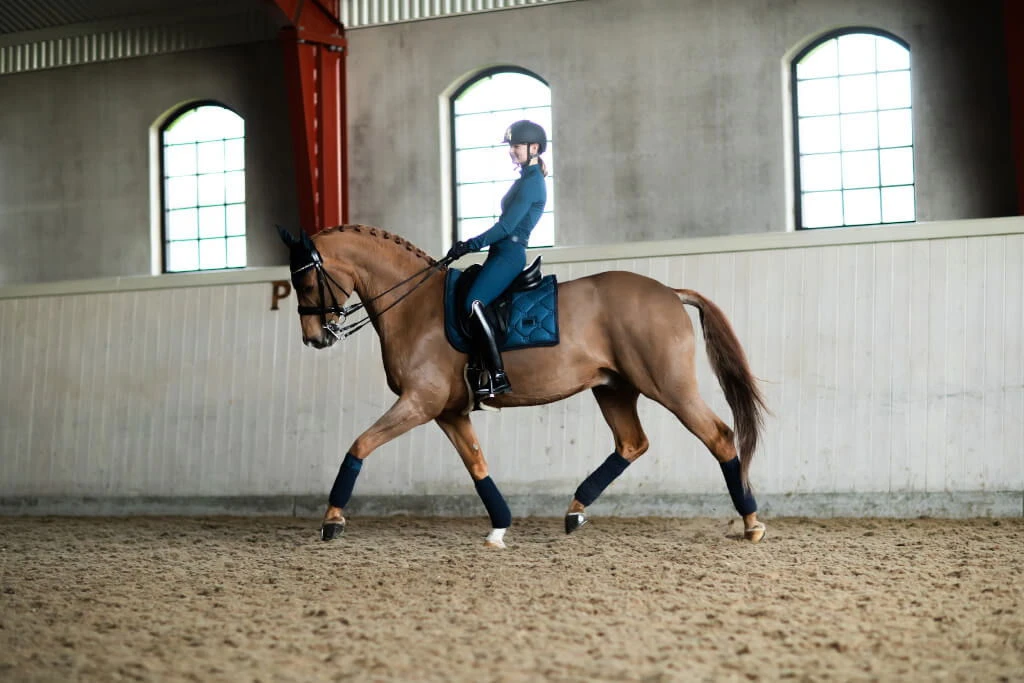 - decorated with the Equestrian Stockholm badge in dark blue