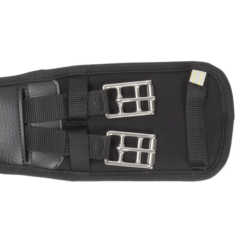 The short girth Memory Foam by Kavalkade fits by the straight cut to each horse and at the D-ring in the center auxiliary reins or breastplate can be attached. The material is memory foam, which is covered with neoprene. Memory foam is a soft gel mass, which adapts to the horse’s stomach and also to any unevenness such as cartilage, bones or small hills. The bumps are pressed into the foam and the pressure shifts around it. This makes this girth ideal for pressure sensitive horses. The fittings at the ends of the girth are made of stainless steel and are used for easy attachment of the girth to the saddle.