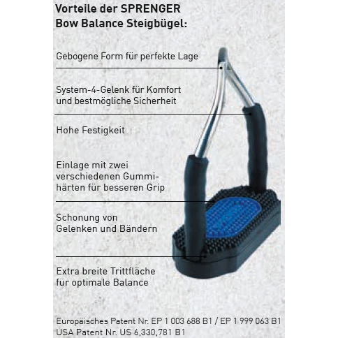 The “Bow Balance” stirrups from HS Sprenger directly combine several aspects that make for good and safe riding. The tread surface is extra wide and has two different rubber hardnesses, so that you have more grip while riding and shocks are absorbed. Thanks to the proven System 4 joint, the foot is released more easily and quickly in the event of a fall, thus preventing or minimizing injuries. This system also gives you much more flexibility, relieving the rider’s hip, knee, ankle and calf joints. Due to the curved shape in the upper part of the stirrup, the stirrup lies even better on the horse and is therefore easier to pick up. The movable part of the stirrup is covered with a rubber coating, so that it is protected from environmental influences such as sand or moisture and has a long life span. The blue Sprenger lettering on the tread surface makes the stirrup a real eye-catcher and gives it a sporty look. A stirrup with a top price-performance ratio, which you should not miss! The article number is 44266.
