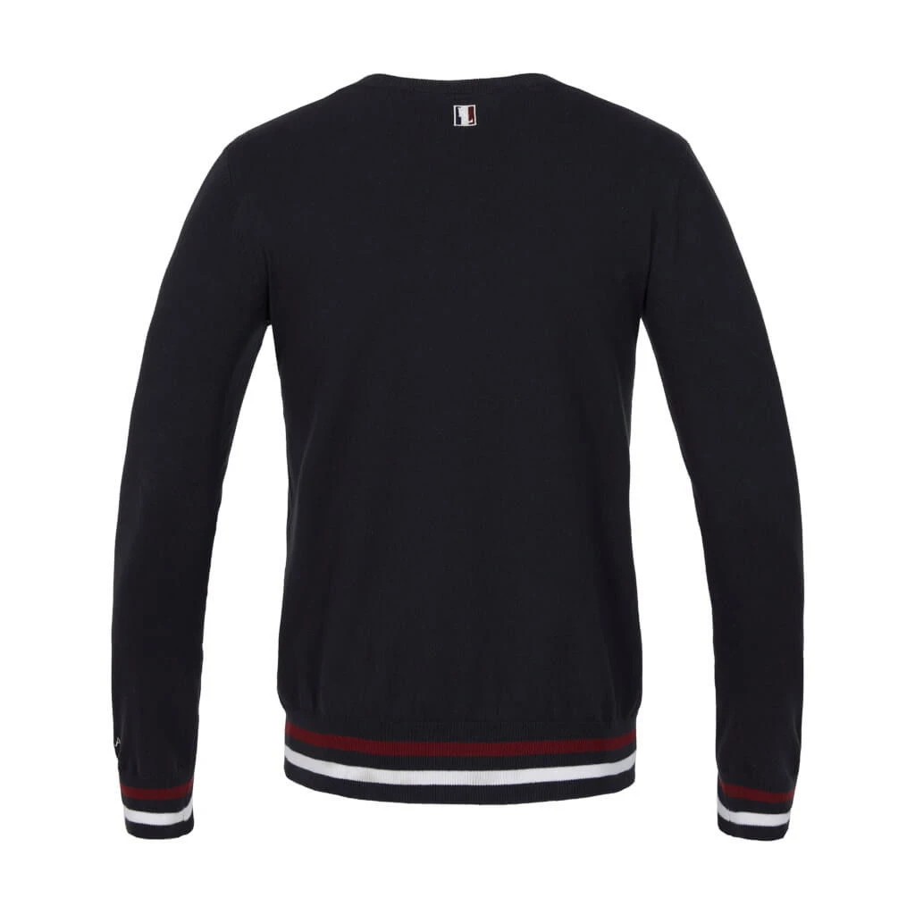 The Kingsland sweater Classic with V-neck makes every outfit a real eye-catcher. Thanks to the material composition of 80 % organic cotton and 20 % nylon, the top is durable and at the same time has a high wearing comfort. At the cuffs and hem, the sweater was provided with contrasting stripes in the colors cream and burgundy. On the left chest as well as in the neck and on the left lower sleeve the Kingsland logo was embroidered. Thus, the timeless and classic design makes the simple sweater a perfect companion in the stable, at the competition or even in leisure time.