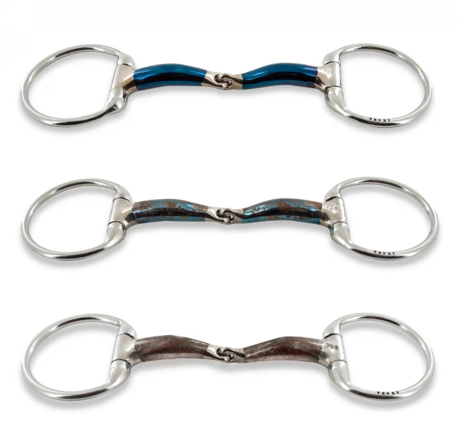 Trust’s “sweet iron” bits have a mouthpiece made of steel, which has a recognizable blue color. When this special alloy comes into contact with moisture, a kind of surface rust is formed, which tastes sweet and thus naturally stimulates saliva production. For this reason Trust bits are accepted and accepted by almost all horses. Due to this rust development (oxidation) the blue color of the TRUST bit changes to gray to brown. The Sweet Iron bit will form a thin orange-brown layer of rust on the mouthpiece when temporarily not in use. This can be easily removed with a damp cloth. The special thing about wind-up bridles are the nylon cords, which are threaded through the side of the bit and on the lower ring of which you can attach another rein. The upper part is buckled into the halter like a cheek piece. This system aims to lift and tilt the bit when the reins are accepted and should therefore only be used with fine aids. Ride-up bridles are especially suitable for horses that are very strong or for very sensitive horses, as the rider gains a maximum of control due to the double bridle guidance. The lateral “olives” of the olive head bit, effectively prevent the lips from being pinched and thus contribute to the wearing comfort. The flattened mouthpiece achieves a stronger effect on the tongue because its rounded contours exert pressure on the tongue.