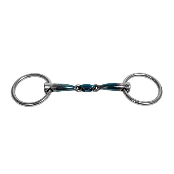 The pony loose ring bit by Trust is anatomically shaped and specially adapted to the size of a pony’s mouth, so that the mouthpiece is thinner and the side pieces are smaller. The snaffle has loose rings, so that the rider’s aids are received more indirectly. In addition, the loose rings allow the bit to move more freely in the mouth, which makes it very well accepted by most ponies. The standard double-broken mouthpiece has two hinges and distributes the pressure to the tongue, the interdental spaces and the corners of the mouth. The blue colour on the bit is a Sweet Iron alloy which forms surface rust on contact with moisture. This rust tastes sweet to most ponies, naturally stimulating saliva production and chewing activity.