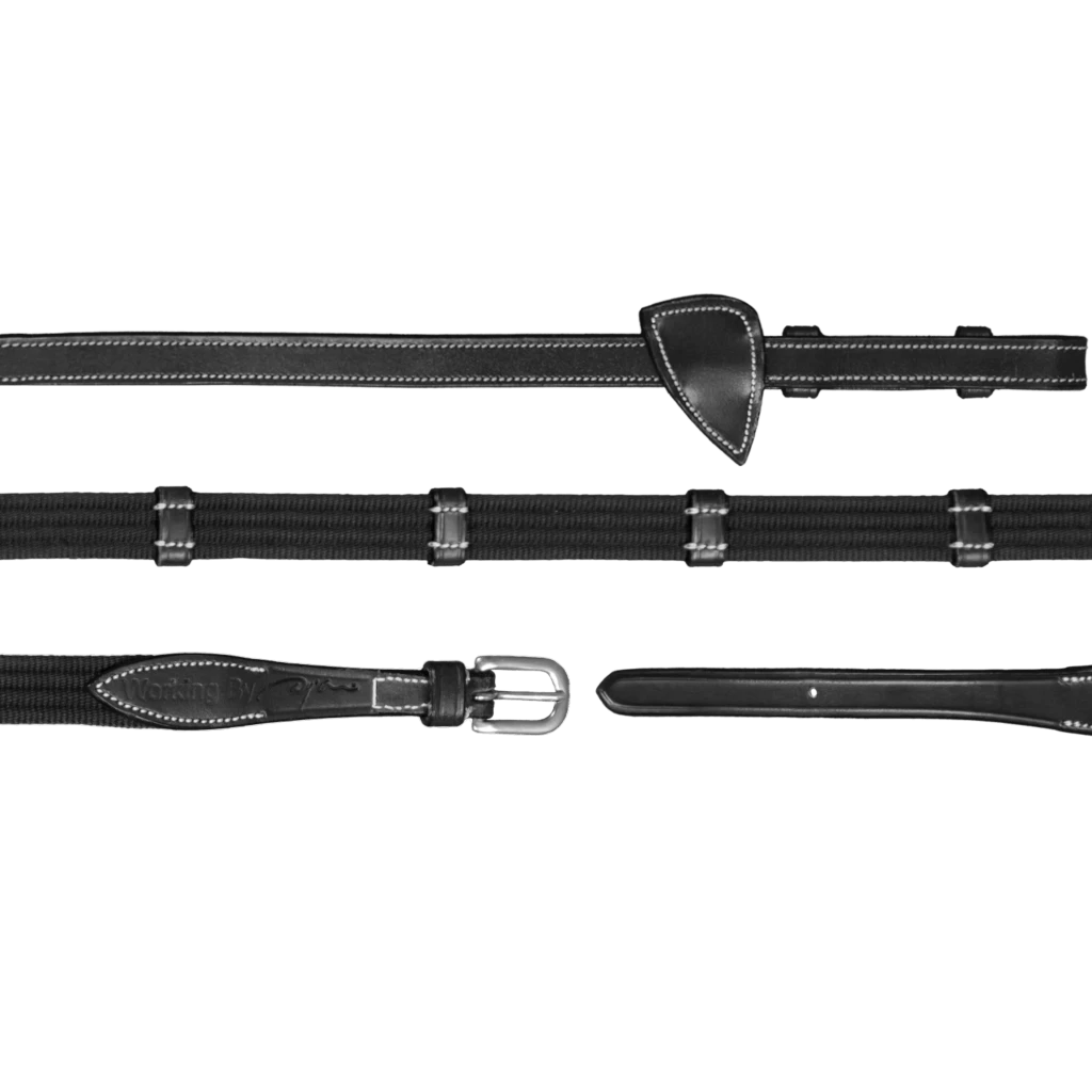 The WC reins by Dyon are made of a robust and tear-resistant webbing material. They are additionally equipped with nine leather bars, which increase the slip resistance and help the rider to find and maintain the correct rein size. With a width of 16 mm, they lie comfortably in the hand. The teardrop-shaped martingale slider is not only pretty to look at, it also ensures that the martingale does not slip and maintains the optimal position. Cream-colored stitching contrasts beautifully with the basic color and makes the reins look particularly elegant.