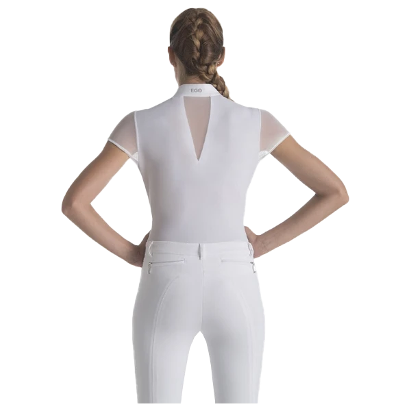 The competition shirt Rita MC by Ego7 has transparent parts and is therefore the eye-catcher of any outfit. The sleeves and the back neckline are made of a transparent fabric and are therefore extremely stretchy. Also the shimmering through of the skin makes the competition shirt a real eye-catcher. The short stand-up collar can be opened and closed with a button attached to the side. On the stand-up collar is the Ego7 logo and in the neck is the brand name embroidered. These are further highlights that the shirt has to offer. The cut of the shirt is figure-hugging and fits closely to the contours of the body. The competition shirt Rita MC is made entirely of technical sports material. This material is both breathable and stretchy. Due to the breathable properties, sweat is absorbed to the outside and a pleasant, cool feeling is given. The shirt protects the skin from UV rays on hot tournament days. Furthermore, it allows for maximum flexibility and comfort while riding.