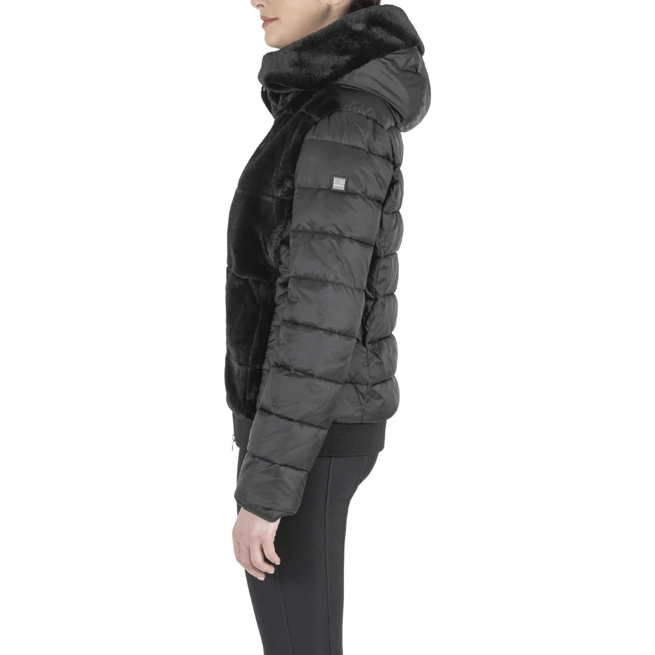 - the hood and front aremade with soft eco-fur, while nylon sleeves and back add a contrasting touch to the design