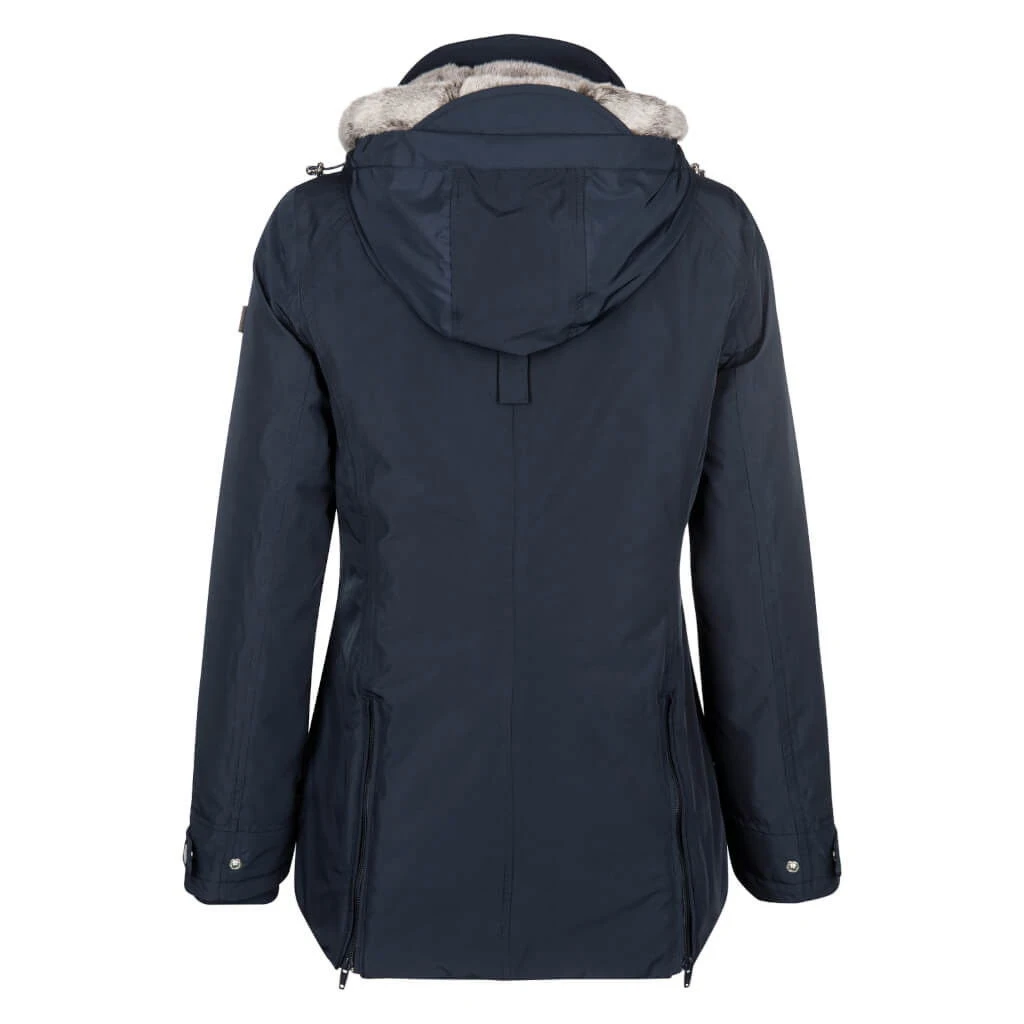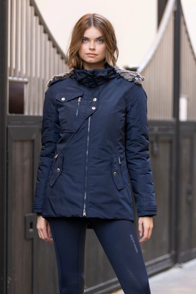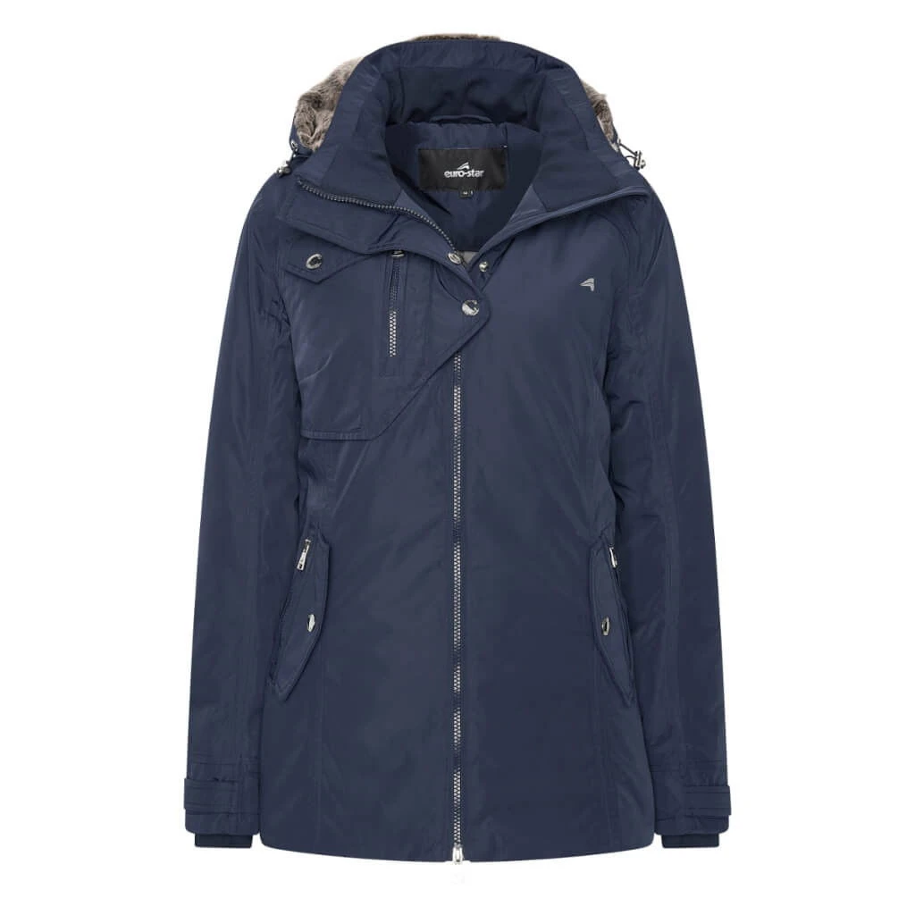 The functional women’s parka ESLajana belongs to the fall/winter collection 2022 by Euro Star. Thanks to outer material, which is made of 100% polyest, the parka is waterproof and windproof. The lining of the jacket is composed of polyester and polyamide. Due to the composition, the parka provides optimal protection from the cold and is ideal for cold winter days. The sealed seams of the jacket ensure that no water can penetrate. The parka is equipped with a lined hood, which provides additional warmth in wind and rain. On the inside there is a closable cell phone pocket, which has an eyelet for cable routing for headphones and makes it much easier to make phone calls or listen to music. The outside is equipped with many other zipper and snap pockets, which provide ample storage space and make the jacket very practical. Thanks to the closable walking slits on the back as well as the 2-way zipper on the front, the ESLajana model allows sufficient freedom of movement and can also be worn while riding.